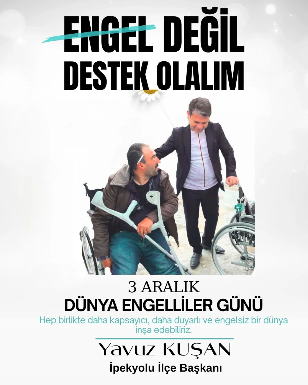Adalet ve Kalkınma Partisi (AK PARTİ) Van İpekyolu ilçe Başkanı Yavuz Kuşan 3 Aralık Dünya Engelliler günü Münasebetiyle bir mesaj yayınladı.