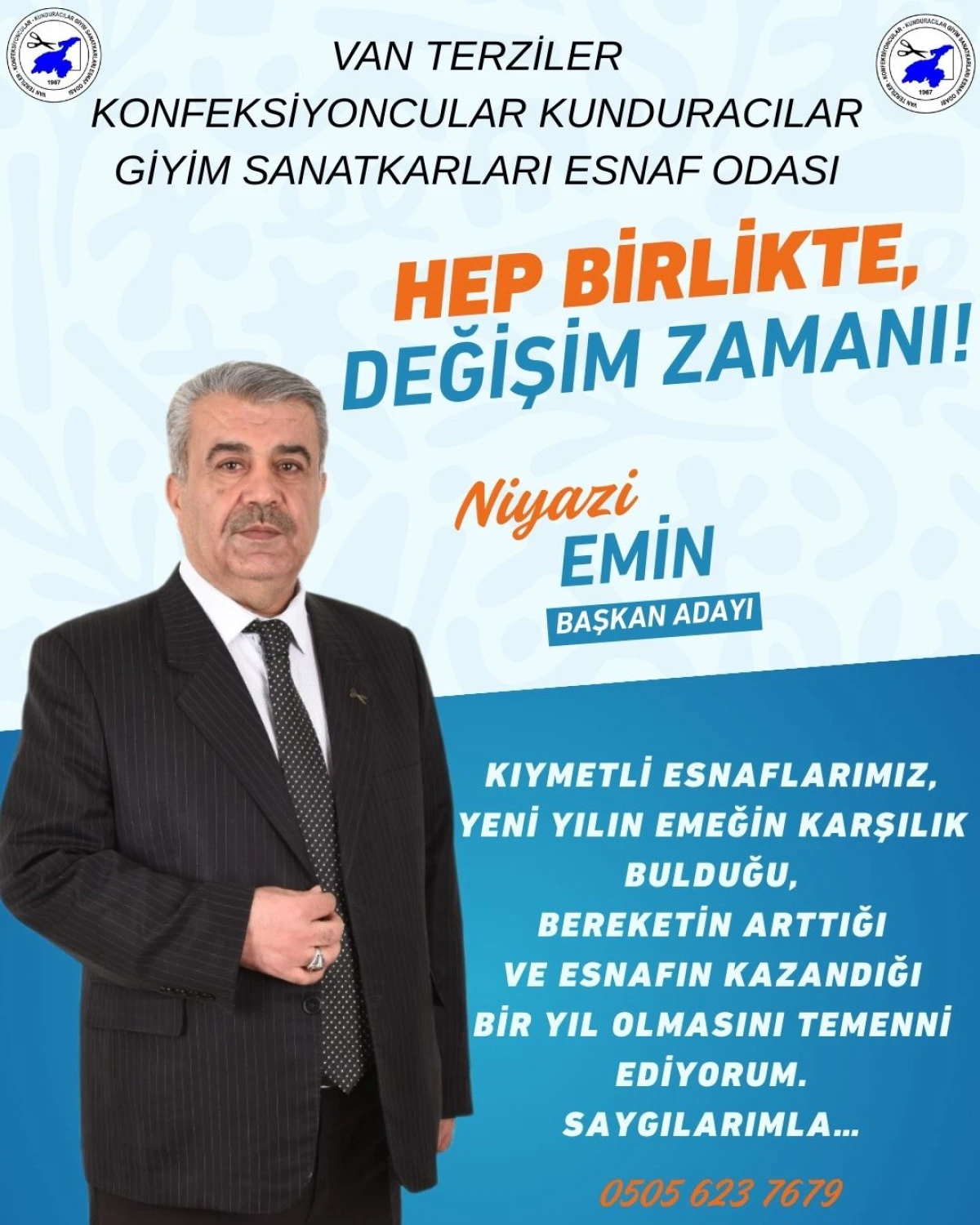 Van Terziler Konfeksiyoncular Kunduracılar Giyim Sanatkarları Başkan Adayı Niyazi Emin yeni yıl mesajı yayımladı.