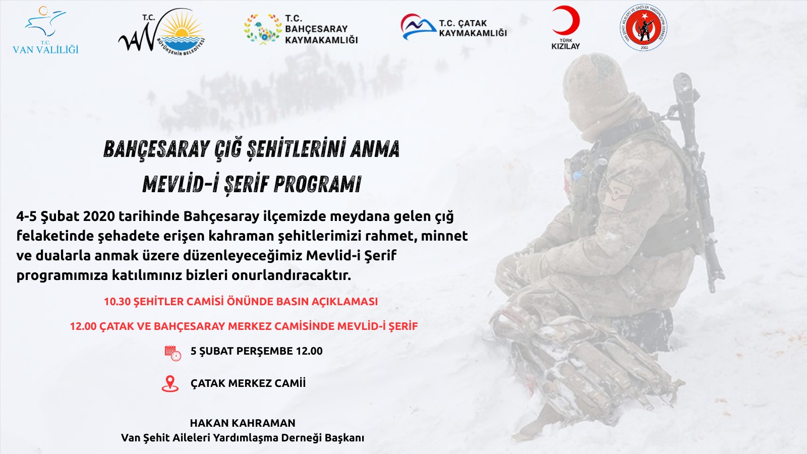 2020 Kış mevsiminde Van'ın Bahçesaray ilçesinde meydana gelen çığ felaketinde şehadete erenler için mevlit okutulacak. Söz konusu program ile ilgili Van Şehit Aileleri Yardımlaşma Derneği Başkanı Hakan Kahraman'dan açıklama geldi.